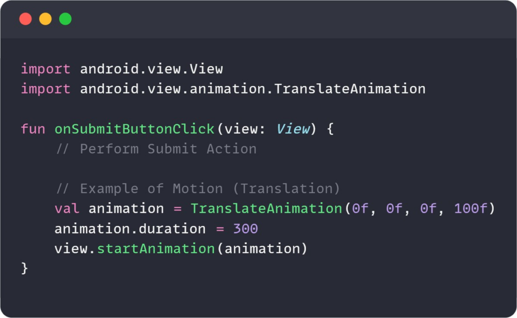 Explanation: Incorporating motion not only makes the app visually engaging but also serves a functional purpose, such as providing feedback on user actions. In this example, the button animates when clicked, giving the user a sense of interaction and continuity.