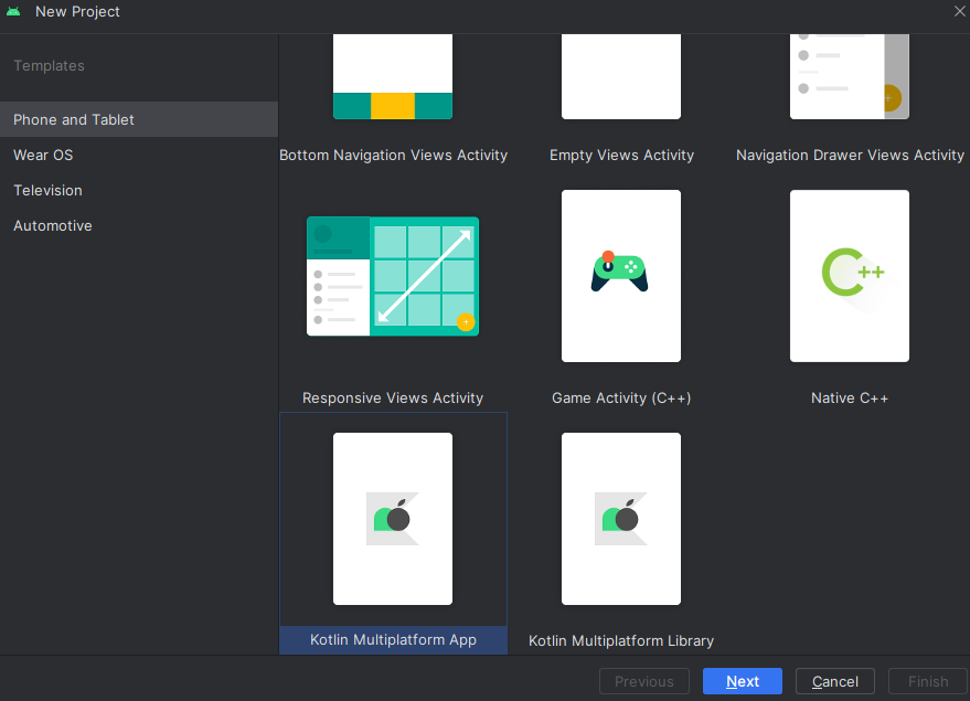 Now, here you can see Kotlin Multi-platform App activity. Click on Next, Name your application and click on Next.