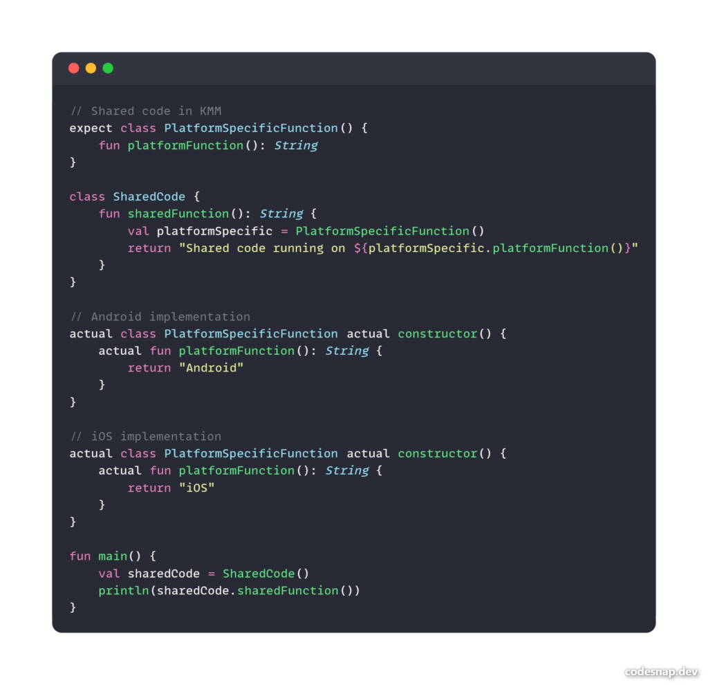 Above code demonstrates the use of the expect and actual keywords in KMM to define platform-specific implementations of a function. The shared code in SharedCode can be used on both Android and iOS platforms, and the platformFunction() method provides different implementations based on the platform. When you run this code on Android, it will print “Shared code running on Android”, and when you run it on iOS, it will print “Shared code running on iOS”.