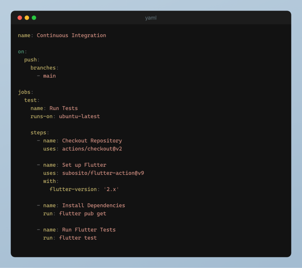 In this example, whenever code changes are pushed to the ‘main’ branch of the repository, GitHub Actions will automatically run Flutter tests. You can configure similar workflows on other CI/CD platforms like CircleCI or Jenkins to suit your project’s needs.