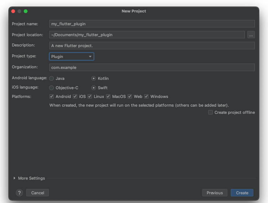 You can create a Flutter plugin either using Android Studio or from the command line.