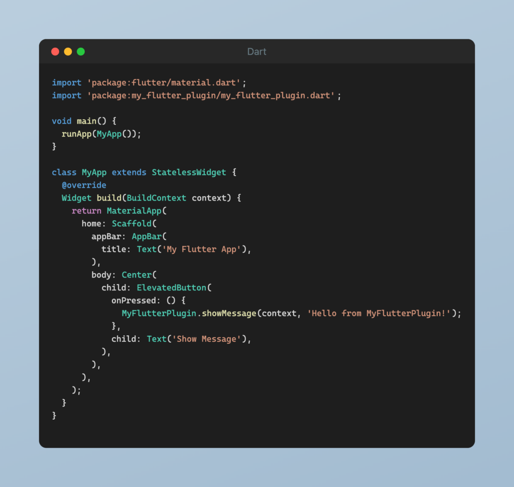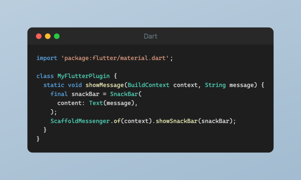 For example, let’s create a simple plugin that displays a message in the snackbar. Modify my_flutter_plugin.dart as follows:
