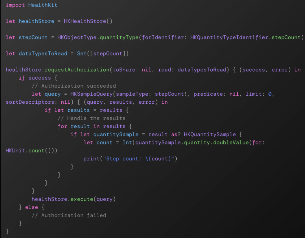 In this example, we first create an instance of HKHealthStore. We then create an HKQuantityType instance for the step count data type, and add it to a set of data types that we want to read. We then request authorization from the user to read the data types using healthStore.requestAuthorization.