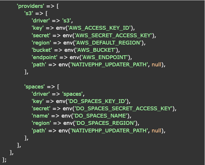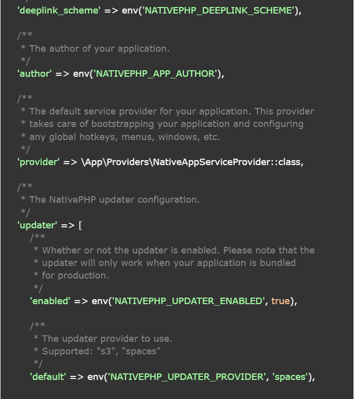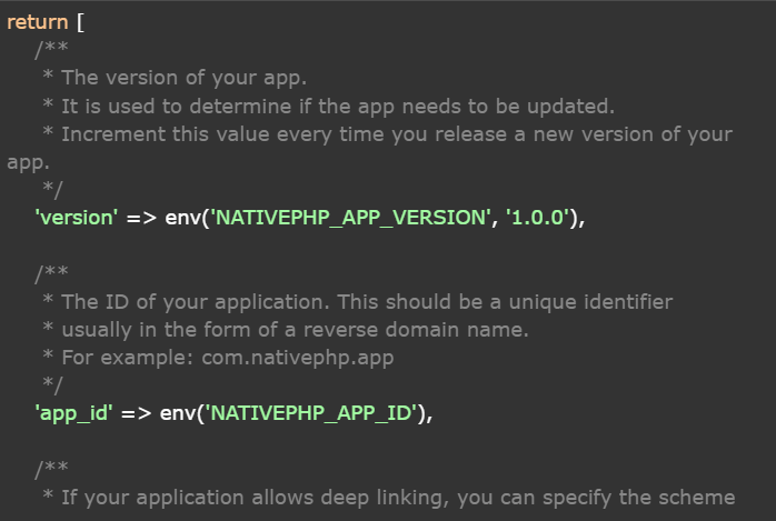 The configuration file, namely config/nativephp.php, is represented by the following code snippet.