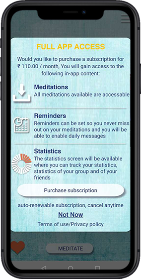 In the app users will find five meditations for free in Basic app version. Users have to purchase the premium version (subscription) in order to access other different kinds of 35 and more meditations and app features. Users can purchase a different subscription plan via in-app purchases.