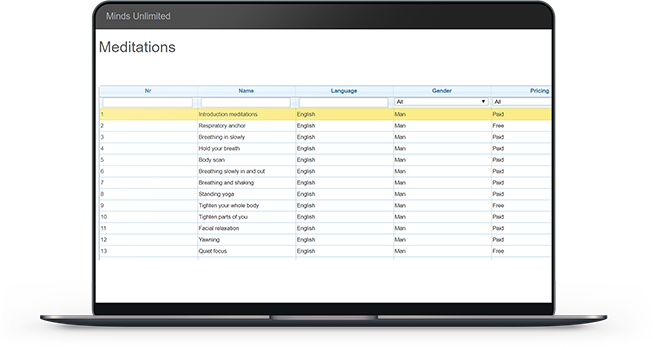 Admins can add or remove and create a list of meditations that will be offered to the end user. The list of meditations can be provided to the end user for a custom program or as per the user's skills and needs.
