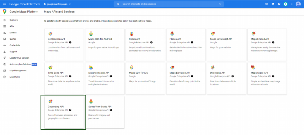 - You can now see the list of the APIs with description of each, click on the API whatever you want to create, in my example I am going to create a Geocoding API.