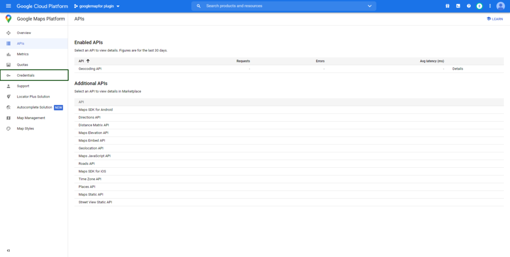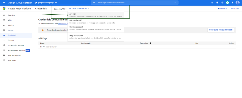 - Once you’ve enabled your API, click on the Credentials to create credentials to get an API key.
