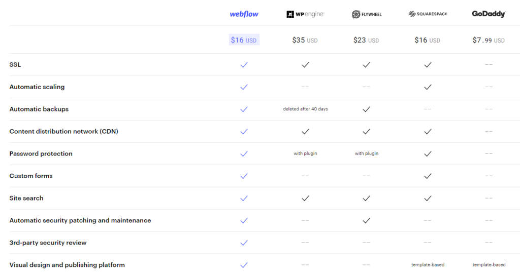 As per the table, Webflow’s hosting is cheaper than many other prominent hosting platforms on the market.